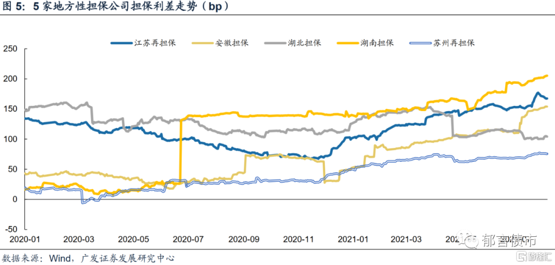 5家地方性担保公司,除了江苏再担保和苏州再担保,其他担保公司的样本相对较少,时间序列受样本的扰动较大,更适合观察担保个券的担保利差走势。2020年11月以来,江苏再担保的担保利差上升较多,由65bp上升至160bp左右,反映了市场对其担保效力认可度的提高;苏州再担保由30bp上升至75bp左右。湖南担保由于新增担保主体的资质较弱,担保利差处于较高水平。