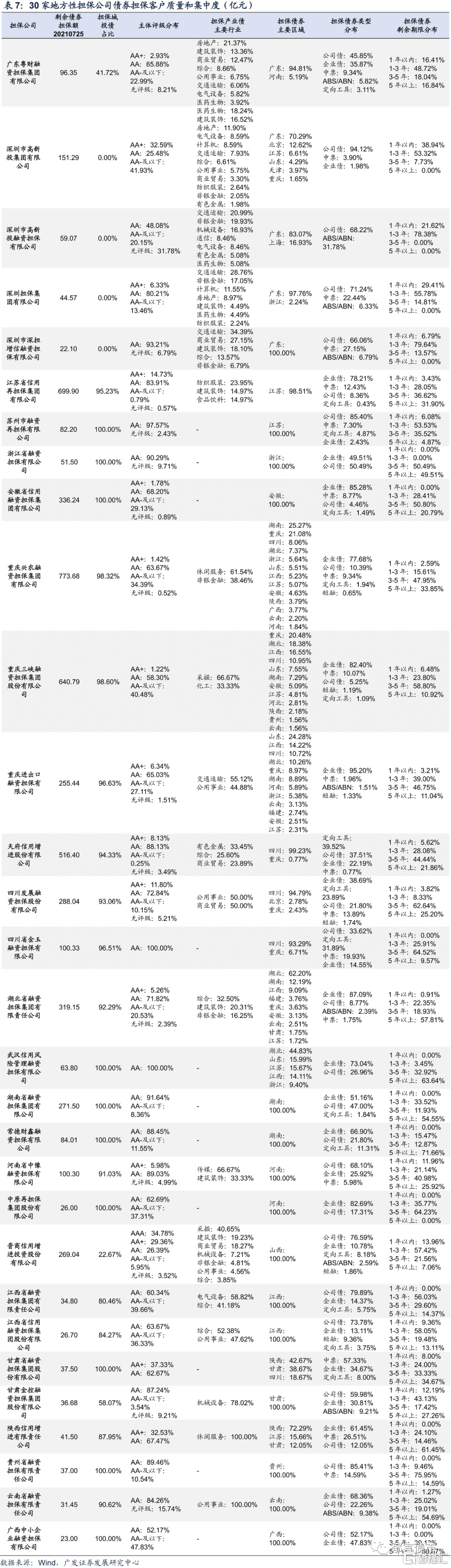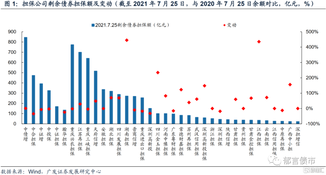 债券担保额继续上升、增速有所放缓,不同担保公司的债券担保规模变动出现分化,部分地方性担保公司加快债券市场布局、扩张较快。据Wind统计,截至2021年7月25日,剩余债券担保额超过20亿元的担保公司共有36家(不包括仅担保资产支持证券的平安普惠担保),比2020年同期多6家,包括6家全国性担保公司和30家地方性担保公司。其中,规模排名前五的分别是中债增、重庆兴农担保、重庆三峡担保、天府信增和江苏再担保,剩余债券担保额在500-850亿元左右。随着地方性担保公司的增多和业务扩张,行业集中度有所下降,2021年7月25日,前十大担保公司市场占有率为65%,低于2020年同期的75%。