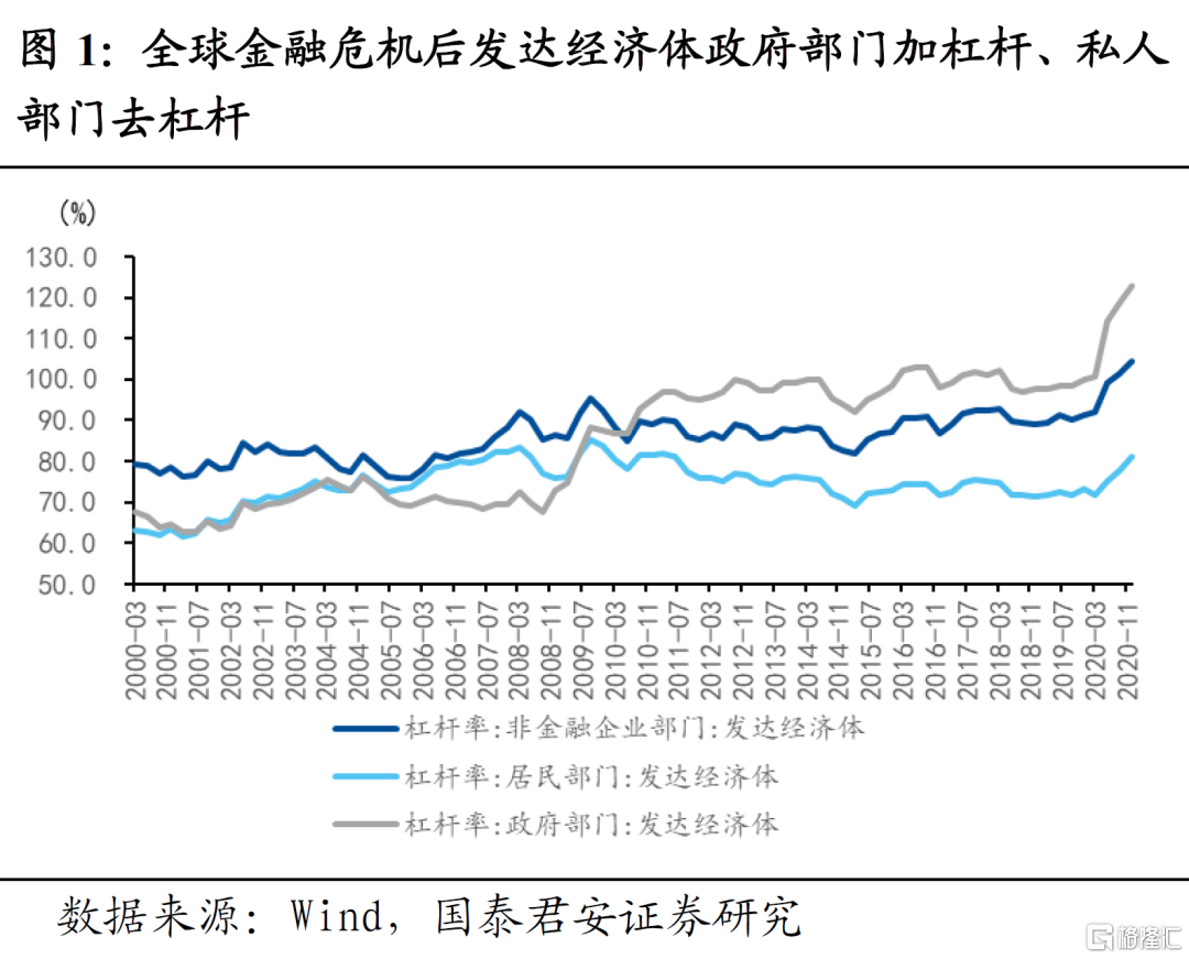 我们发现,居民部门杠杆率变化与房地产销售和投资密切相关,非金融企业杠杆率变化领先信用利差,政府部门杠杆率变化与国泰君安广义财政指数(GTJA-GFI)基本一致,而政府部门+非金融企业部门杠杆率变化对基建投资具有指示意义。