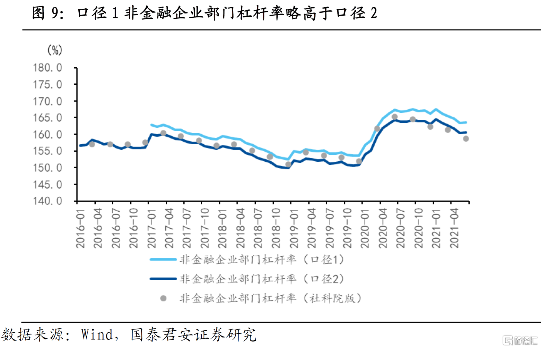 从非金融企业部门杠杆率来看,两种口径的非金融企业部门杠杆率走势一致,但口径1的测算结果略高于口径2。社科院版的非金融企业部门杠杆率大致处于两种口径之间,2017年口径1的月度杠杆率比社科院版高大约2个百分点,一定程度上印证了社科院版将部分地方隐性债务从非金融企业部门划归到政府部门债务的推断。