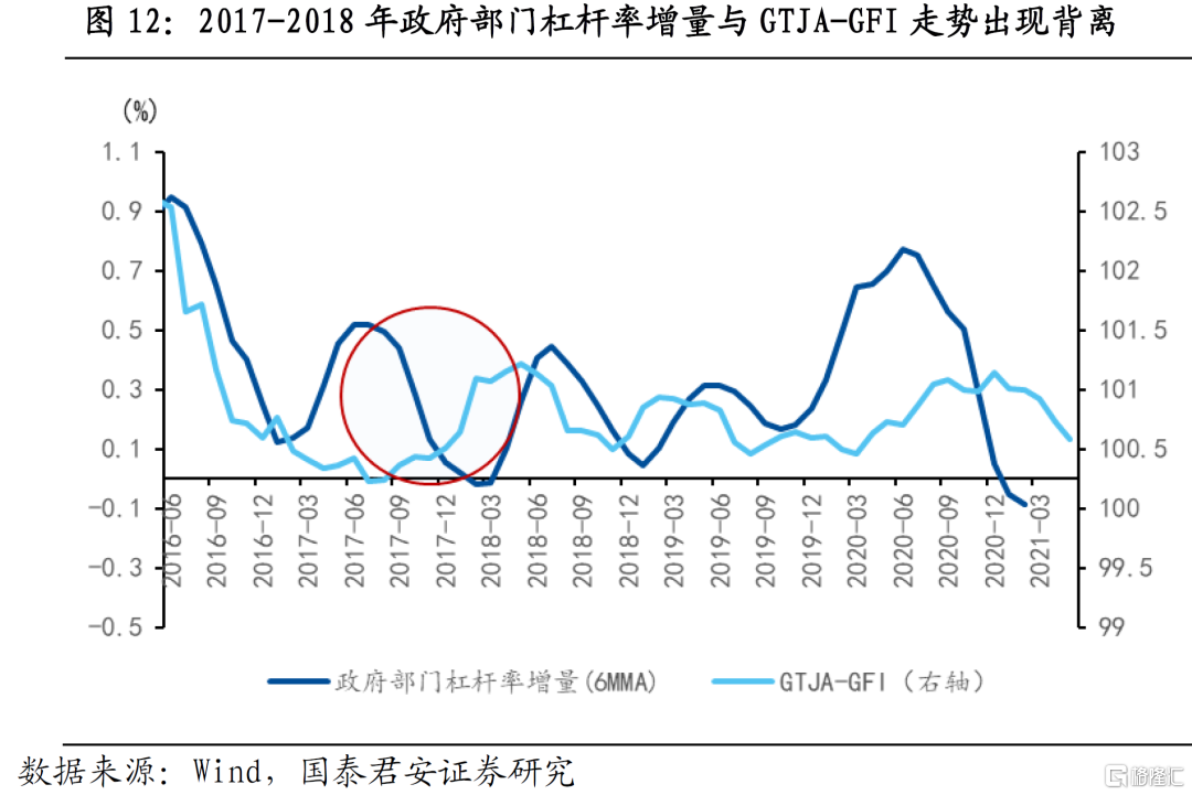第二,政府部门杠杆率增量与GTJA-GFI在大部分时间里一致,仅在保障性财政扩张时期出现明显背离。政府部门杠杆率增量与GTJA-GFI走势基本一致,唯一例外的时期是2017年下半年到2018年上半年,GTJA-GFI上行而政府部门杠杆率增速下行。原因在于,一方面,2017年的广义财政扩张主要由“保障性财政”支撑,预算内财政赤字更多通过盘活存量、使用结转结余资金等方式实现,国债和地方政府债发行规模并未出现显著提升,因而也并未形成大量存量债务;另一方面,2017年名义GDP增速提升也使政府部门实现降杠杆。当前二者均处于下降阶段的尾部,预计下半年随着广义财政发力,政府部门杠杆率增量与广义财政均将触底反弹。