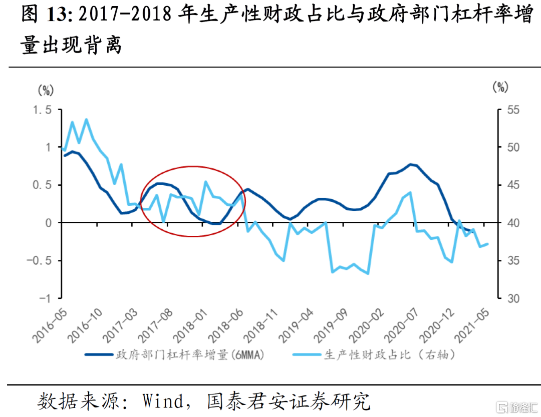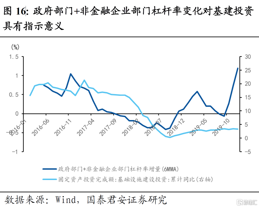 5)2016年以来随着生产性财政的趋势性下降,政府部门杠杆率向基建投资的传导出现钝化,政府+非金融企业部门杠杆率变化对基建投资更具指示意义。