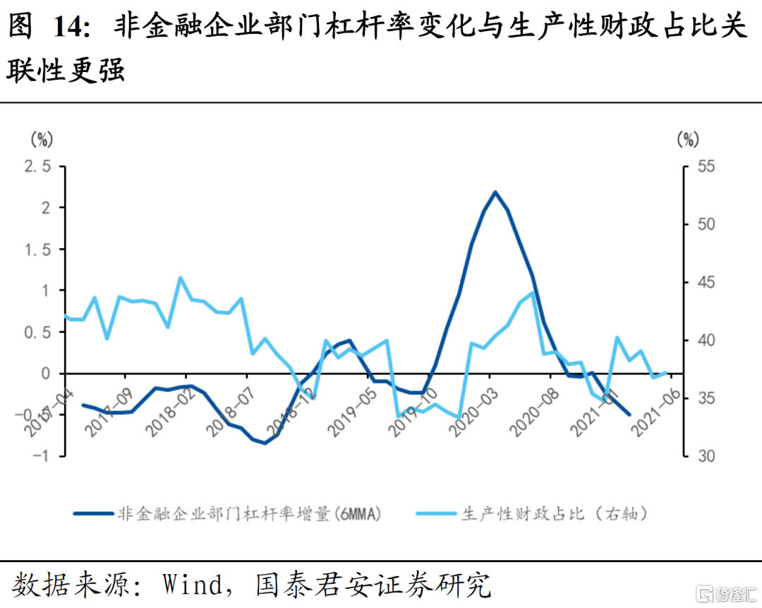 4)政府部门、非金融企业部门杠杆率变化与生产性财政占广义财政比重走势基本一致,但非金融企业部门杠杆率变化与之关联性更强;