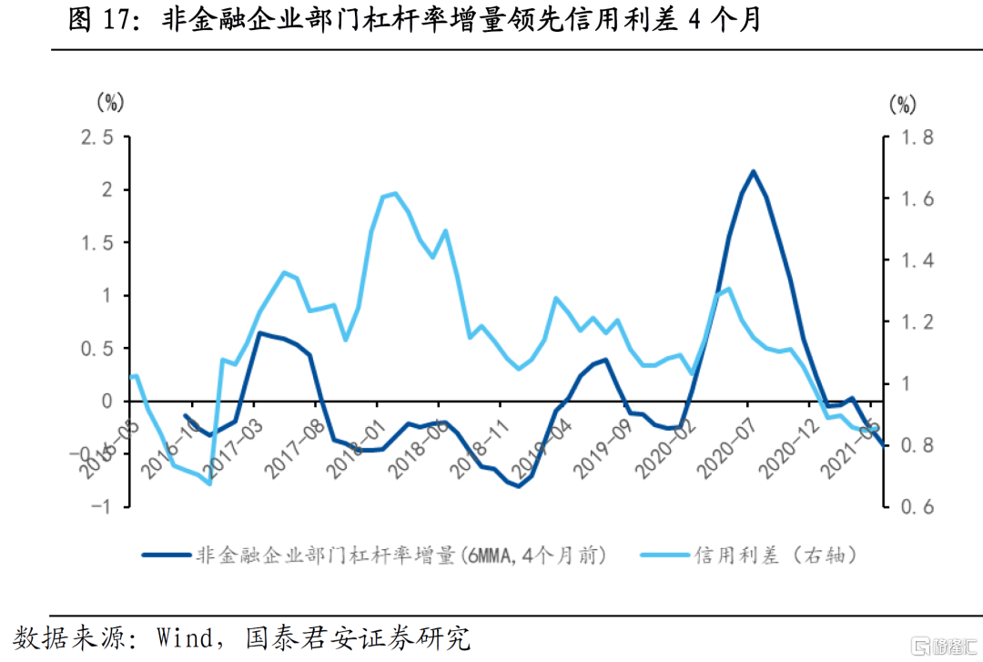2)非金融企业部门杠杆率变化领先信用利差4个月;