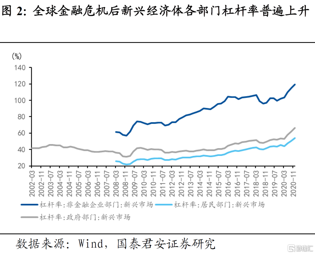 第一,宏观杠杆率是国际通用的衡量债务可持续性的指标。国际清算银行(BIS)会公布季度频率的世界主要经济体非金融企业部门、居民部门和政府部门宏观杠杆率。可以看到,2008年全球金融危机之后发达经济体主要表现为政府部门加杠杆和私人部门去杠杆,而新兴经济体各部门杠杆率则在普遍上升,其中以非金融企业部门杠杆率上升幅度最大。通过观察各国各部门宏观杠杆率,我们可以对其债务可持续性作出较为直观的判断。
