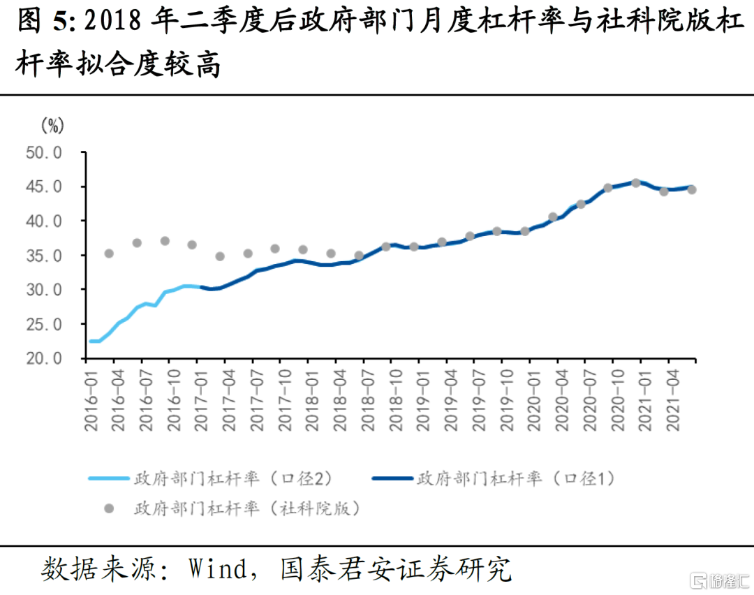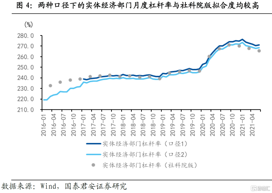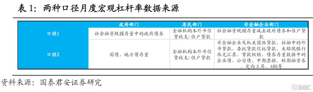为提高结果的稳健性,我们还尝试采用债券存量数据的口径(口径2),测算另一版本的月度杠杆率。其中政府部门统计国债和地方债存量;居民部门用央行公布的金融机构本外币资金运用中的住户贷款;非金融企业加总金融机构本外币资金运用中的非金融企事业单位贷款,社会融资规模存量中的委托贷款、信托贷款、未贴现银行承兑汇票、贷款核销,以及企业债、公司债、中期票据、短期融资券、定向工具和资产支持证券等。最后,加总三个部门的债务规模得出实体经济债务水平。