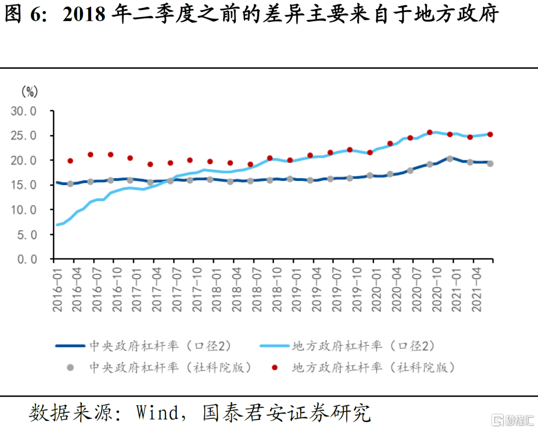 从政府部门杠杆率来看,两种口径下的政府部门杠杆率差别不大,与社科院版的季度数据在2018年二季度以后拟合度很高,2018年二季度之前社科院版本的政府部门杠杆率比我们测算的结果高3-5个百分点;进一步观察中央政府杠杆率和地方政府杠杆率,发现差异主要在地方政府部门。