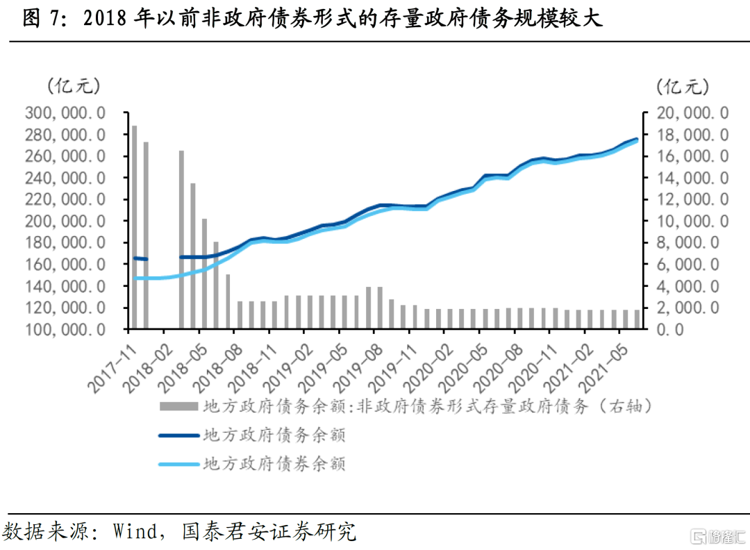 2018年之前,我们测算的月度杠杆率与社科院季度杠杆率的差异源于地方隐性债务。我们测算的地方政府杠杆率的债务数据为地方政府债券(包括地方一般债和地方专项债)的存量,而社科院的统计口径中将部分政府具有偿还责任的隐性地方债务(主要是城投债)计为地方政府债务。从财政部公布的地方政府债务余额数据来看,2017年12月非政府债券存在的存量政府债务为1.7万亿,大约占地方政府债务余额的11%,这与2017年12月我们测算的地方政府杠杆率与社科院测算的2017年第四季度地方政府杠杆率的差距基本一致。而随着地方隐性债务逐渐化解(划归为地方政府显性债务或非金融企业债务),非政府债券形式存量政府债务规模仅剩1751亿元,则社科院版政府杠杆率与我们构建的月度政府部门杠杆率也趋于一致。虽然财政部的政府债务余额数据更为准确,但其公布时间为次月月末,时效性较差,因此我们仍采用政府债券的数据口径,由于非政府债券形式存量债务占比很小且非常稳定,所得结果几乎不会对我们的分析造成干扰。