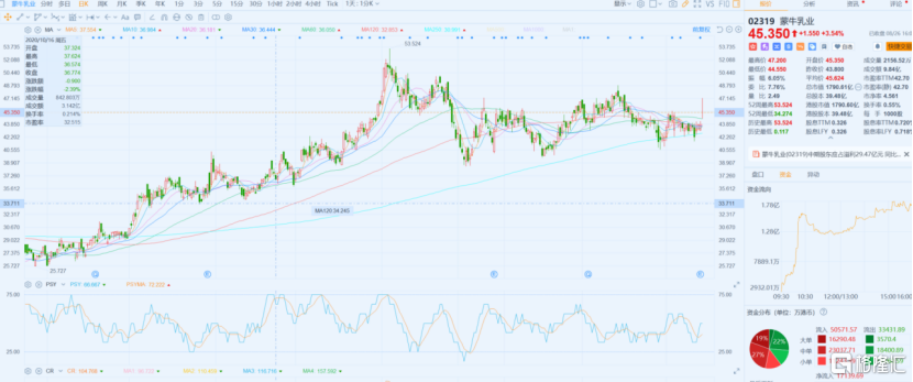 受此消息影响,蒙牛乳业当日高开3.54%,随即股价一路攀升,每股最高一度触及47.2元。截至发稿,蒙牛股价暂报45.35元,总市值1790亿元。