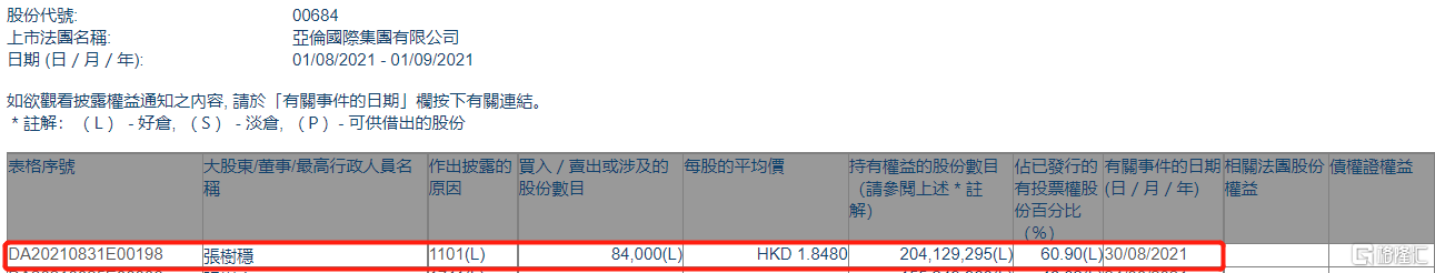 格隆汇APP获悉,根据联交所最新权益披露资料显示,2021年8月30日,亚伦国际(00684.HK)获执行董事兼董事总经理张树稳在场内以每股均价1.848港元增持8.4万股,涉资约15.52万港元。
