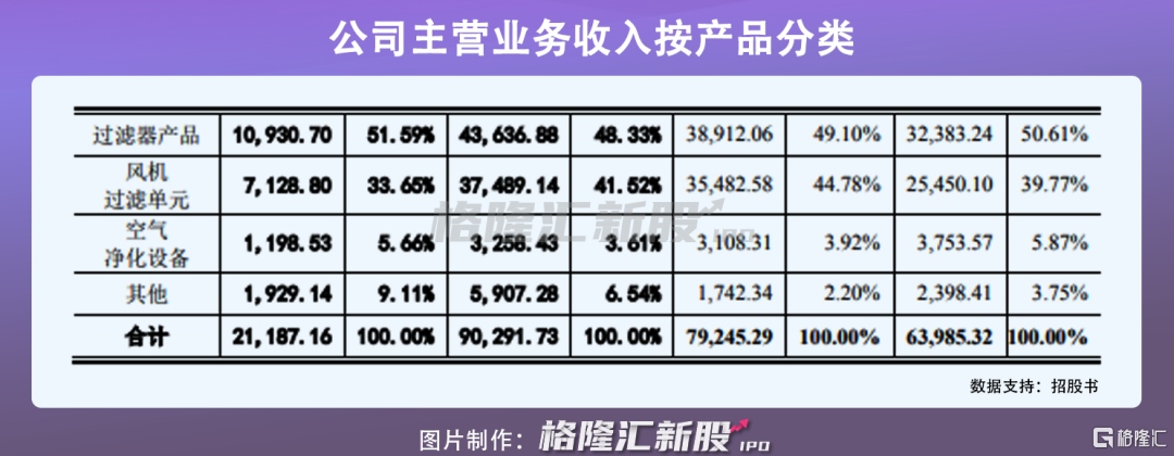 具体来看,洁净室空气净化业务主要为下游半导体、生物制药和食品等领域企业提供过滤器产品,且对半导体的气态污染物提供去除技术。而室内空气量化等级品质优化业务则主要针对医疗机构、大型商用楼宇、公共场所、家居环境等场景,为其提供初中效过滤器、静电过滤器及空气净化器产品。报告期内,过滤器产品和风机过滤单元合计收入占比超九成,其中过滤器产品占比达到近50%左右。