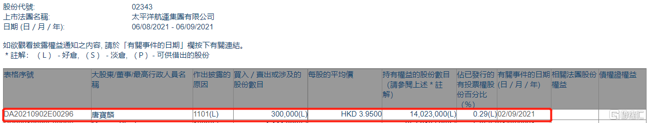 太平洋航运(02343.HK)获主席唐宝麟增持30万股