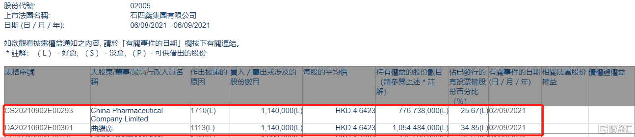 格隆汇APP获悉,根据联交所最新权益披露资料显示,2021年9月2日,石四药集团(02005.HK)获执行董事、主席、行政总裁曲继广在场内以每股均价4.6423港元增持114万股,涉资约529.2万港元。
