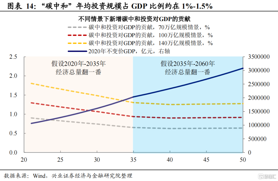 实现“双碳”目标需要持续性的资金投入,估算显示,中性情景下实现“双碳”目标所需年均投资规模约占GDP的1%-1.5%左右。