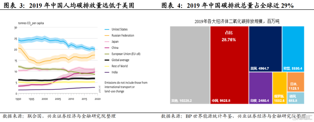 中国人均碳排放不高,但碳排放总量较大,“双碳”目标任重道远。2019年,中国人均碳排放量远低于美国,但碳排放总量达到98.26亿吨,占全球比例为28.76%,是全球最大的排碳经济体,中国实现“碳中和”目标任重而道远,是一个“久久为功”的过程。