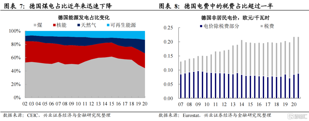 从国际经验看,德国在能源结构转型过程中电价经历了上涨。德国早在1990年就提出了可再生能源补贴政策,进入新世纪以来又先后出台了可再生能源发展相关的明细规定、纲要等。进入新世纪以来,德国可再生能源发电占比持续上升,当前已经占到总发电比重的15%左右,近年来德国煤电占比也出现明显下降,已从2015年的61%下降到了2020年的44%,不到总发电量一半。在德国长达30年的能源结构转型历程中,电价也一路上涨,其中相关税费上涨是主要驱动,而税费主要部分是“可再生能源附加费”。