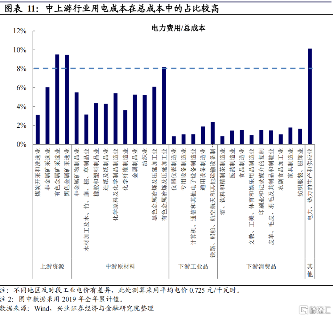 从上下游行业层面看,上中游行业生产使用的电力较多,受电价上涨影响较大。若电价上涨,上下游行业之间可能面临价格传导风险。