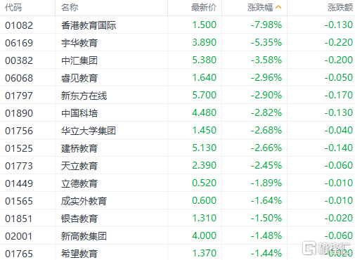 教育股普跌。香港教育国际跌近8%,宇华教育跌超5%,中汇集团跌超3%,睿见教育、新东方在线、天立教育、新高教集团、希望教育等跟跌。