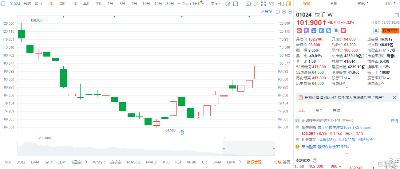 个股方面,快手-W收涨9.33%报101.90港元,最新总市值4239.19亿港元。日前,中国投资信息有限公司发布《关于沪港通下港股通股票名单调整及下一次定期调整时间的通知》,包括快手在内的11股获纳入沪港通下港股通。此外,数据显示,快手在9月2日、3日、6日连续三个交易日获南下资金买入,累计净买入约13.9亿港元。