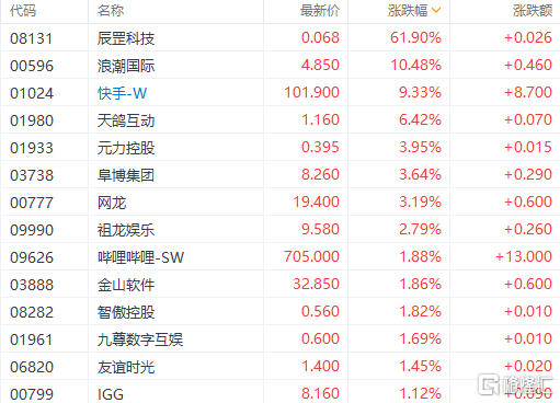 软件开发板块涨幅居前。辰罡科技大涨61%,浪潮国际涨超10%,快手涨超9%,哔哩哔哩、金山软件涨超1%,天鸽互动、元力控股、友谊时光、阜博集团跟涨。