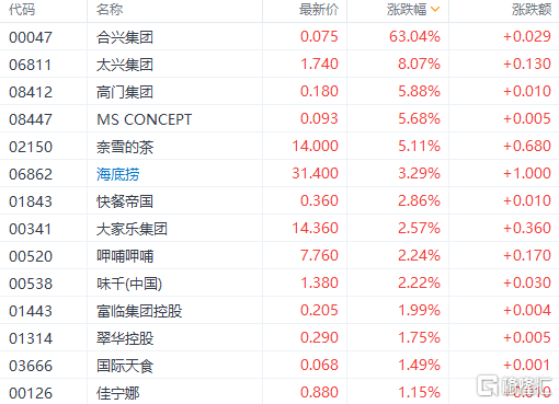 餐饮股大反弹。奈雪的茶涨超5%,海底捞涨3%,呷哺呷哺、味千(中国)、大家乐涨超2%。安信证券指出,受七月末疫情多地爆发的影响,餐饮8月经营数据短期承压,但随着疫情逐步得到控制,预计餐饮业有望逐步恢复,目前时点继续推荐海底捞&九毛九。