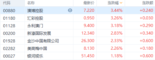 濠赌股全线上涨。澳博控股、汇彩控股、永利澳门涨超3%,新濠国际发展、金沙、美高梅中国涨超2%。据悉,粤澳新通道青茂口岸将于9月8日(即明日)正式开通启用。目前,青茂口岸开通前的各项准备工作已基本就绪。花旗发报告指,虽然放宽旅行限制方面缺乏进展,令澳门博彩业投资者感到失望,但仍然认为近期相关股票调整属过度,而令板块估值更具吸引力。