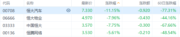 恒大概念股集体下挫。恒大汽车跌超11%,恒大物业、中国恒大跌超7%,恒腾网络跌超5%。