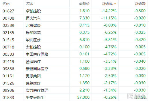 医疗及医疗美容服务板块跌幅居前。卓珈控股跌超14%,北京健康跌超8%,瑞丽医美跌超6%,华润医疗跌超5%,太和控股、奥思集团、平安好医生跟跌。