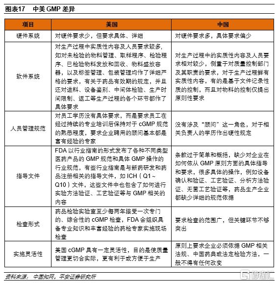 美国拥有全球标准最高的GMP要求之一。20世纪60年代“反应停事件”发生后,各国开始推动药品质量管理立法,美国最早于1962年修订了《联邦食品药品化粧品法案》,并在1963年颁布了世界上第一部GMP。历经FDA数次修订和不断完善后,美国cGMP(Current Good Manufacturing Practices,即动态药品生产管理规范)已经成为全球GMP领域最高水平的代表。而我国首次颁布GMP是在1988年,较FDA晚了20多年,经过1992年、1998年、2010年3次主要修订,2019年12月1日我国新修订《药品管理法》实施后,取消了GMP认证,与规范市场接轨,注重动态监管。尽管我国GMP和美国cGMP涉及的内容大体一致,均针对药品生产过程中的三要素——硬件系统、软件系统、人员管理规范,但侧重点不同,我国与美国仍有较大差距。因此,能通过FDA cGMP认证的国内企业较为稀缺。