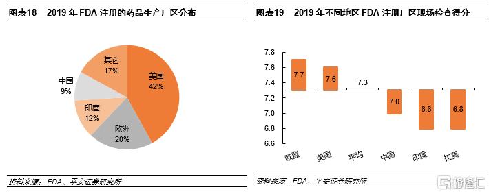 中国列入FDA目录的厂区较少,整体GMP得分低于欧美、高于印度和拉美。根据FDA发布的药品质量报吿,2019年列入FDA目录的厂区一共4273家,较2018年下降8.6%。其中生产经FDA批准药品的厂区仅约2510家,占比约59%。按地区来看,中国厂区数量379个,占比仅9%,低于美国、欧盟和印度。2019年FDA一共实施了1258项现场检查,从平均得分来看,发展中国家普遍低于发达国家,我们认为与当地医药制造业发展水平有关,其中欧盟和美国分别为7.7和7.6分,而中国、印度、拉丁美洲分别为7.0、6.8、6.8分,中国好于印度和拉美。