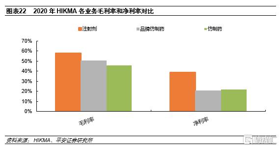 无菌注射剂高壁垒和更好的竞争格局带来更强的盈利能力。无菌注射剂要求严格,企业需要投入大量前期成本和生产运营成本,因此无菌注射剂拥有更高的壁垒和更好的竞争格局,盈利能力高于口服制剂。以HIKMA为例,其注射剂业务毛利率和净利率都显著高于品牌仿制药和仿制药业务。2020年注射剂业务毛利率为57.6%,品牌仿制药和仿制药业务分别为50.1%、45.8%;注射剂业务净利率为38.6%,而品牌仿制药和仿制药业务分别为20.6%、21.6%。