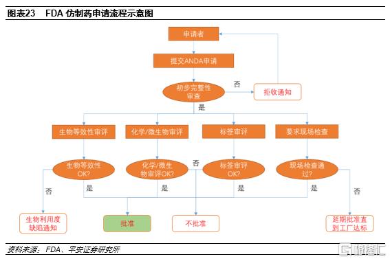 仿制药出口规范市场需获得相应认证,认证路径打通后可复制性强。以美国为例,出口到美国的仿制药需提交ANDA申请,获批后可上市销售。ANDA审评的关键是科学地论述与参比制剂的生物等效性,而不需要提供临床前和临床试验资料。ANDA审评包括生物等效性审评、化学/微生物审评、标签审评和现场检查几方面,是目前世界上最严格和规范的审评体系之一。对仿制药企业而言,一旦打通ANDA申请路径,可快速复制到其他仿制药品种上。