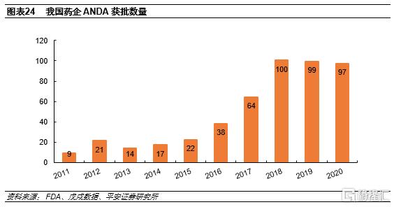 我国获批ANDA数量持续增长,制剂出口进入爆发期。ANDA获批数量是制剂国际化成果的体现,2011年以来我国ANDA数量持续增长, 2016之后快速增加。2020年我国ANDA数量仍高达97个,我国制剂出口已经进入爆发期。其中2011年恒瑞医药的伊立替康注射液在美国获批,成为我国第一个美国上市的注射剂品种。