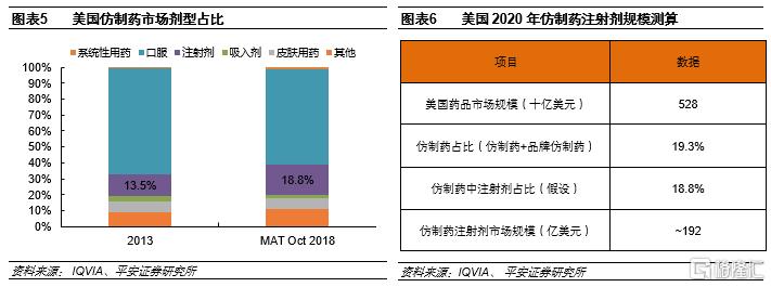 美国仿制药注射剂市场接近200亿美元,是少数高水平玩家的舞台。根据IQVIA数据,2018年美国仿制药中注射剂占比约18.8%,较2013年提升5.3个pp。假设2020年注射剂占仿制药比例不变,则2020年美国整体仿制药注射剂规模约192亿美元,规模可观。根据米内网数据,2019年我国仿制药注射剂市场规模为6000多亿元。虽然从绝对值上看美国仿制药注射剂规模低于我国,但美国注射剂上市门槛高,仿制药注射剂是少数高水平玩家的舞台。