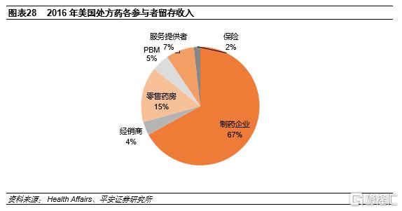 制药企业在处方药流通中留存收入占大头。根据Healthcare Affairs的测试,2016年处方药流通中,制药企业留存收入占比达67%,占了大部分;零售药店和医疗服务提供者(医院/医生等)分别占比15%和7%。