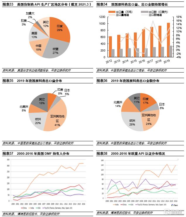我国原料药/中间体优势突出。API在仿制药成本中占比最高,因此掌握API资源对仿制药企业来说至关重要。截至2021年3月,FDA批准的仿制药API生产厂区87%位于美国以外,其中中国占比16%,仅次于印度和欧盟。同时我国API规范市场认证数量持续上升,2016年认证数量仅次于印度,体现了特色原料药向新兴市场转移趋势。而印度是我国原料药出口第一大目标国,对我国依赖明显,印度约70%的原料药来自中国,而中间体比例更高。2019年我国出口至印度的原料药产品共80.79万吨,货值56.53亿美元,占我国原料药出口总额的17%。中国凭借完整的基础工业体系、发酵类产品优势以及产品成本优势,有望取代印度成为全球特色原料药生产环节转移首选地,从而增强我国仿制药企业出口优势。