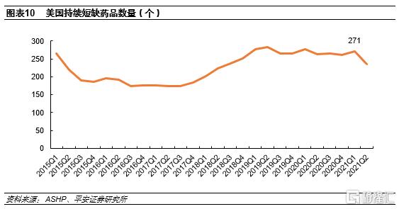 美国药品短缺数量整体呈上升趋势。根据ASHP数据,2018年后美国药品持续短缺数量明显提升,2018Q4为251个,较2017Q4大幅提升37%。2021Q1美国持续短缺的药品数量为271个,2021Q2为236个。