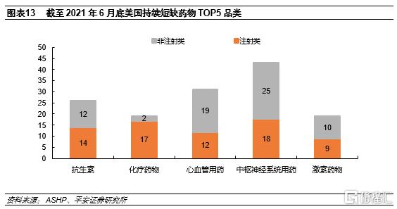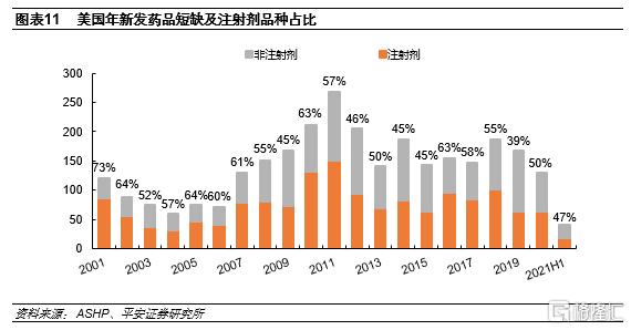 美国短缺药品以注射剂为主,占比在50%以上。根据ASHP数据,美国每年新发药品短缺中注射剂占比基本在50%以上,2001-2020年美国共新发药品短缺2857起,其中注射剂为1549起,占比54%。美国药品短缺以注射剂品种为主。2021年上半年新发短缺39种,其中注射剂占比47%。