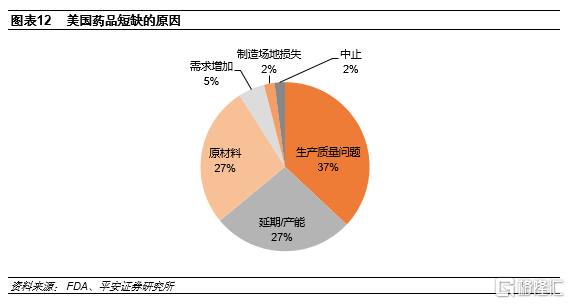 美国药品短缺归因于FDA严格的GMP要求和原材料外部依赖。从美国药品短缺的原因来看,第一大因素是生产质量问题,占比37%,我们认为这主要是由于FDA严格的cGMP要求,尤其是无菌注射剂;第二大原因是延期或产能问题,占比27%,在高标准下产能扩张难度较大;第三大原因是原材料,占比27%,我们认为主要是美国药品生产企业原材料依赖进口所致。
