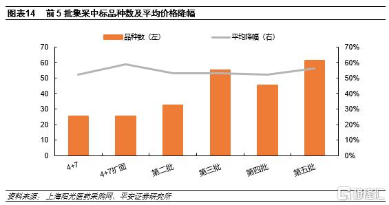 前五批集采平均降价50%以上,大幅压缩市场空间。自2018年首批集采实施以来,共涉及5批243个品种。前5批集采平均降价幅度都在50%以上,大幅压缩集采品种的市场空间。同时,考虑到大品种通常竞争企业较多,降价幅度更大,因此集采前后实际采购金额降幅高于平均降幅。