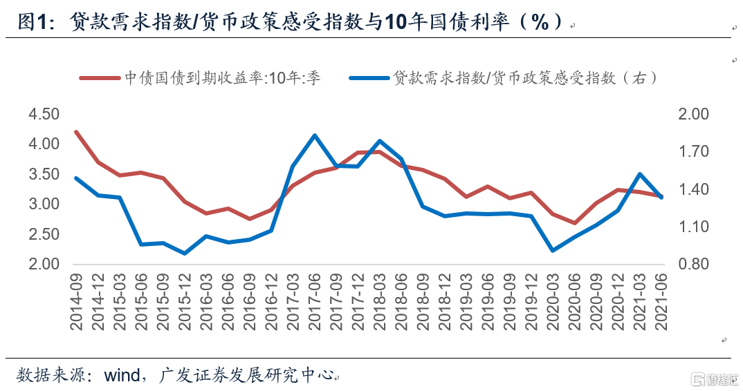 贷款需求指数/货币政策感受指数这一比值即表示金融资产的供需状况。当这一比值向上时,金融资产供给的改善幅度要高于金融资产需求的改善幅度,债券收益率会有向上的压力。从历史经验看,这一比值也确实与十年国债到期收益率有较好的相关性。