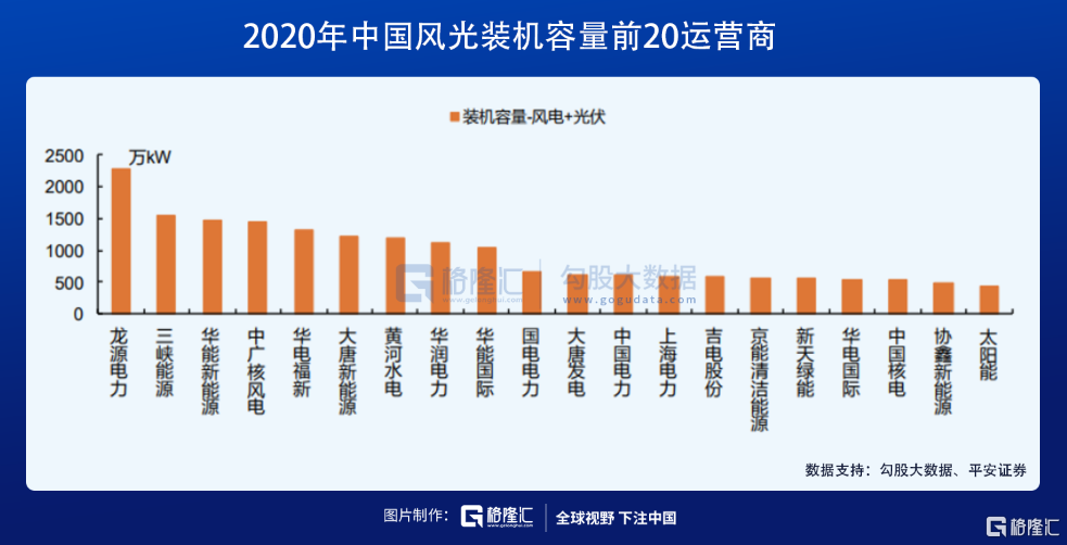 2020年,中国风+光装机容量TOP6分别为龙源电力、三峡能源、华能新能源(私有化)、中广核、华电福新(私有化)、大唐新能源。