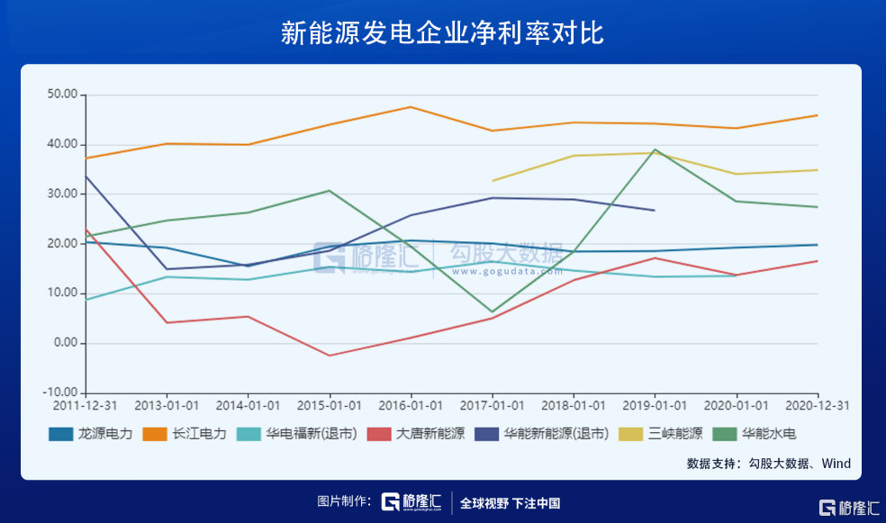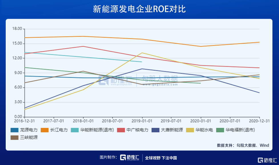 公司毛利率方面,三峡能源、华能新能源、中广核要明显高于另外3家。其中,三峡能源2020年毛利率高达57.3%,高于华能水电的52.4%,略低于长江电力的62.6%。