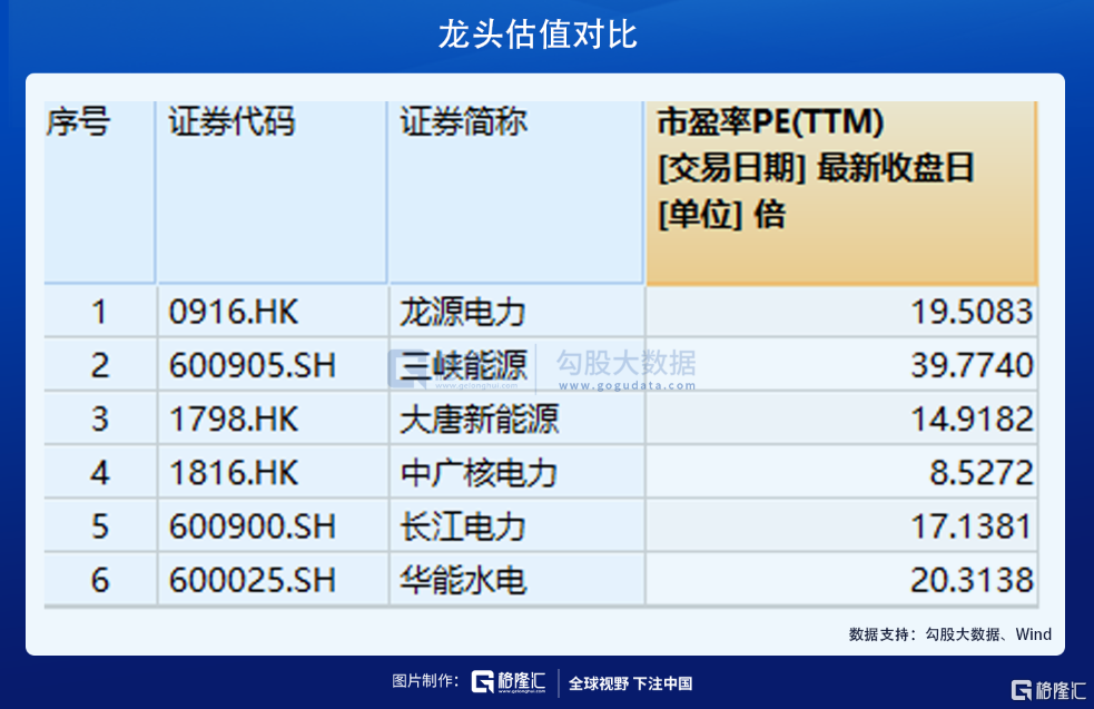 通过以上核心数据对比可发现,长江电力、三峡能源的盈利能力相对最强。当然,市场也给予了昂贵的估值水平。单就风/光龙头来看,三峡能源高达39.77倍,远高于龙源电力的19.5倍和大唐新能源的14.92倍。