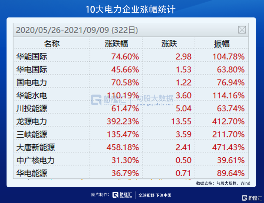 当然了,把时间维度拉长,风电、光伏为主营的新能源发电企业涨势更为喜人——从去年5月底算起至今,龙源电力大涨392%,大唐新能源大涨458%。
