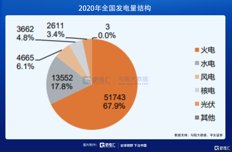 2020年,全国发电量中,火电5.17亿千瓦时,占比仍然高达67.9%,而风电和光伏占比仅为6.1%、3.4%。
