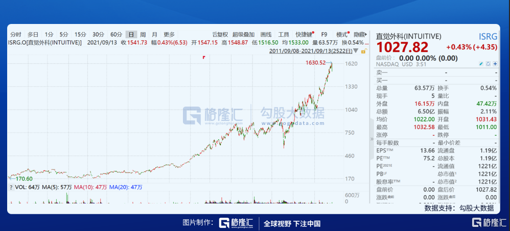 以美股医疗器械股为例,直觉外科,是一家全球领先的机器人辅助微创手术技术公司。公司主要从事设计、制造和销售达芬奇外科系统及相关仪器配件。经营表现整体呈现稳定增长态势,近5年营业收入和净利润的CAGR分别为13.44%和18.60%,研发费用五年来CAGR达到23.11%。其公司也颇受华尔街资本的喜欢,跑出十年十倍的行情。