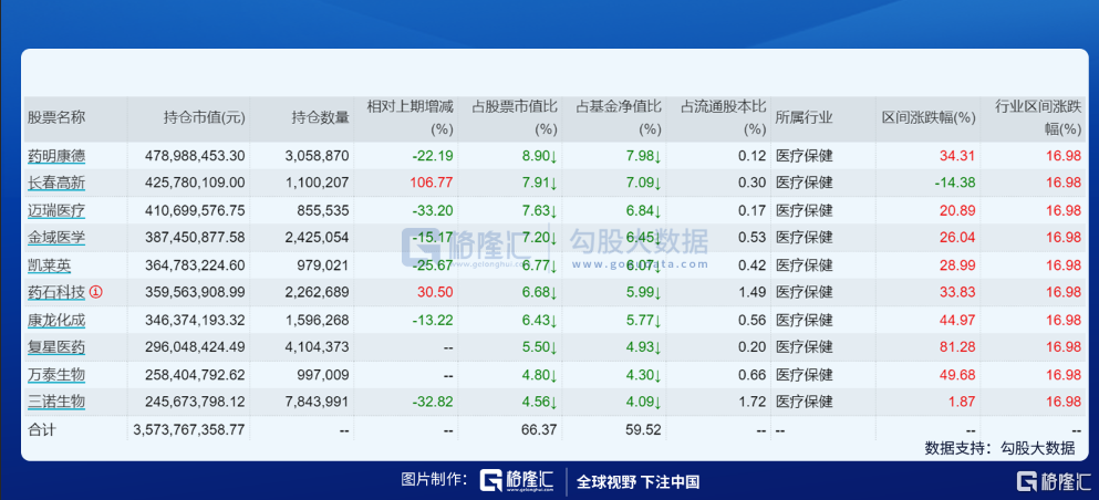 基金经理的业界知名的葛晨,整体资金规模在59.88亿元,从持仓来看,前五大重仓股分别是:药明康德、长春高新、迈瑞医疗、金域医学,凯莱英,其余也是医疗领域的龙头股。