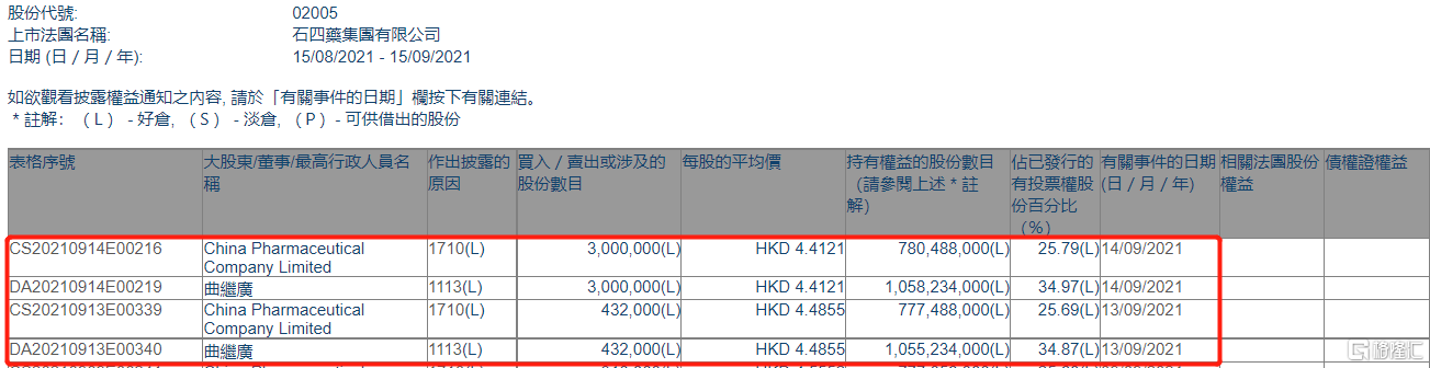 格隆汇APP获悉,根据联交所最新权益披露资料显示,2021年9月13日-9月14日,石四药集团(02005.HK)获执行董事、主席、行政总裁曲继广在场内以每股均价4.4121-4.4855港元合计增持343.2万股,涉资约1526.8万港元。