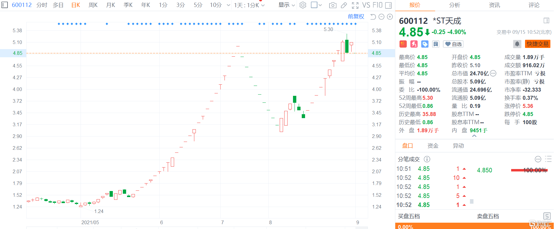 格隆汇9月15日丨*ST天成(600112.SH)今日复牌一字跌停,报4.85元,卖一封单达42万手,最新总市值25亿元。公司昨晚收到了上交所下发的监管问询函,要求公司结合目前被实施退市风险警示的情况,充分说明并提示公司是否存在退市风险。2021年半年报显示,报告期内,*ST天成实现营业收入4747.32万元,同比减少40.32%;归属净利润-1331.1万元,扣非后归属净利润-3167.91万元;报告期末归属于上市公司股东的净资产为负值。深交所也要求*ST天成补充披露营业收入同比大幅减少的具体原因,说明公司持续经营能力方面存在的重大不确定性,并充分提示风险。